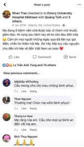 Nhờ ơn trên và tổ tiên sắp đặt, 20 năm trước, Con trai út của con đã đi xuất gia. Đến nay cũng đang là 1 vị thầy trẻ có tâm và có tài, là 1 vị Đại Đức& đang là Tiến sĩ Phật Học, Thầy cũng đi Hoằng pháp khắp nơi trong nước & nước ngoài, Châu Âu & Châu Mỹ nên được nhiều đạo tràng trong và ngoài nước yêu mến & nương theo tu tập. Cũng nhờ vậy quen biết nên khi con bị bệnh, Thầy quen biết nhiều nên con đã được giới thiệu & gửi gắm vào rất nhiều nơi uy tín để chữa bệnh. Vào bệnh viện con được nằm điều trị ở các phòng chăm sóc đặc biệt kiểu như đang ở khách sạn. Dù là con có công với cách mạng nên con có thẻ điều trị miễn phí ở tất cả các bệnh viện trên toàn Quốc; nhưng vì lo cho mẹ, các con có chút điều kiện, 2 con gái của con 1 đứa ở Mỹ, 1 đứa ở Anh, nên các con của con thường cho mẹ đến các bệnh viện Quốc Tế để được điều trị đặc biệt hơn, tuy vậy bệnh tình con ngày 1 nặng hơn.