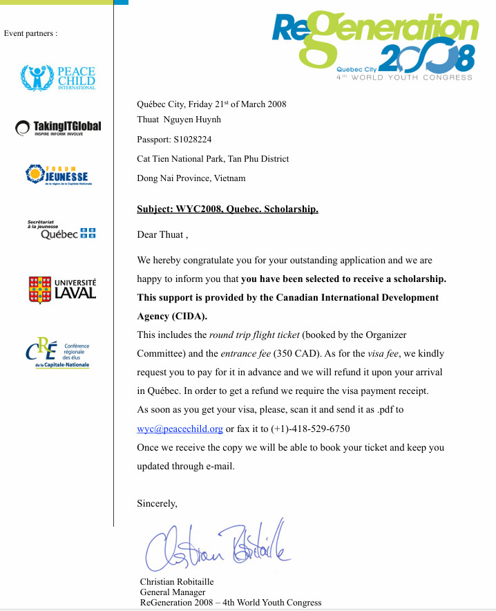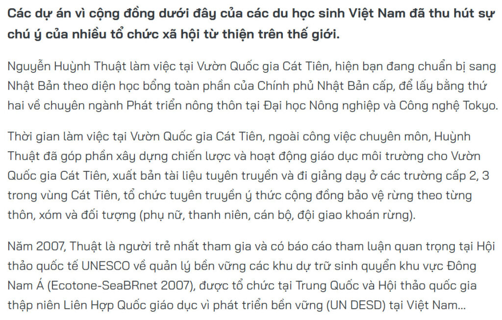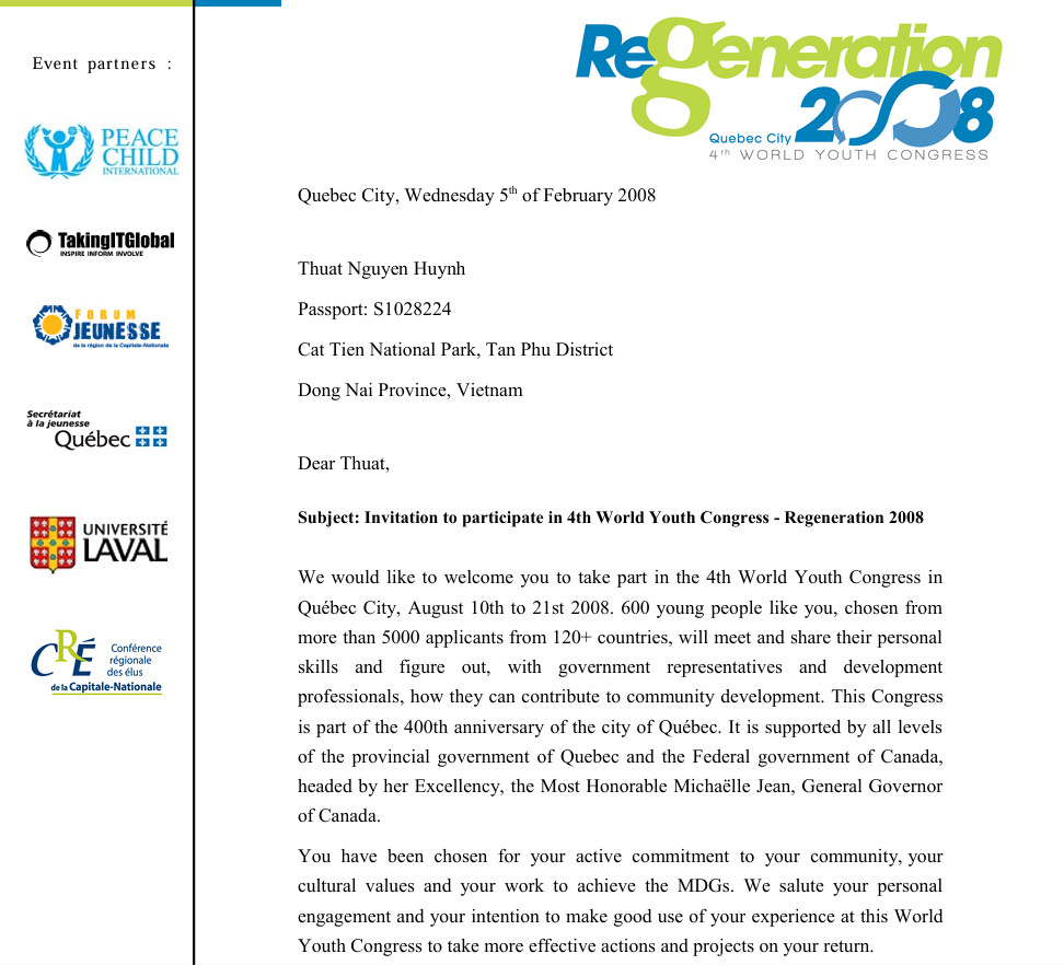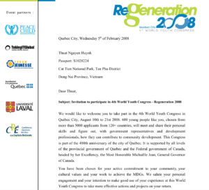 Đã hơn 17 năm, vào tháng 08 năm 2008, qua Hội nghị Thanh niên Thế giới (Quebec, Canada, báo Thanh niên có đưa tin, xem ảnh), tôi chia sẻ tham luận về mối liên hệ mật thiết giữa con người và thiên nhiên, đồng thời đề xuất mạng lưới 4Es – Environment Ethics Education in English for Peace and Environment, nhằm kết nối thanh niên toàn cầu trong hành động vì môi trường – vì hòa bình – vì trái đất xanh – vì Mái nhà xanh chung duy nhất của tất cả chúng ta đến 600 đại diện thanh niên của hơn 120 quốc gia. Đây là minh chứng rằng tiếng nói của thanh niên Việt Nam có giá trị, đã được thế giới lắng nghe và trân trọng.